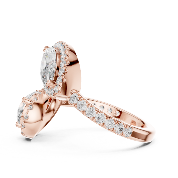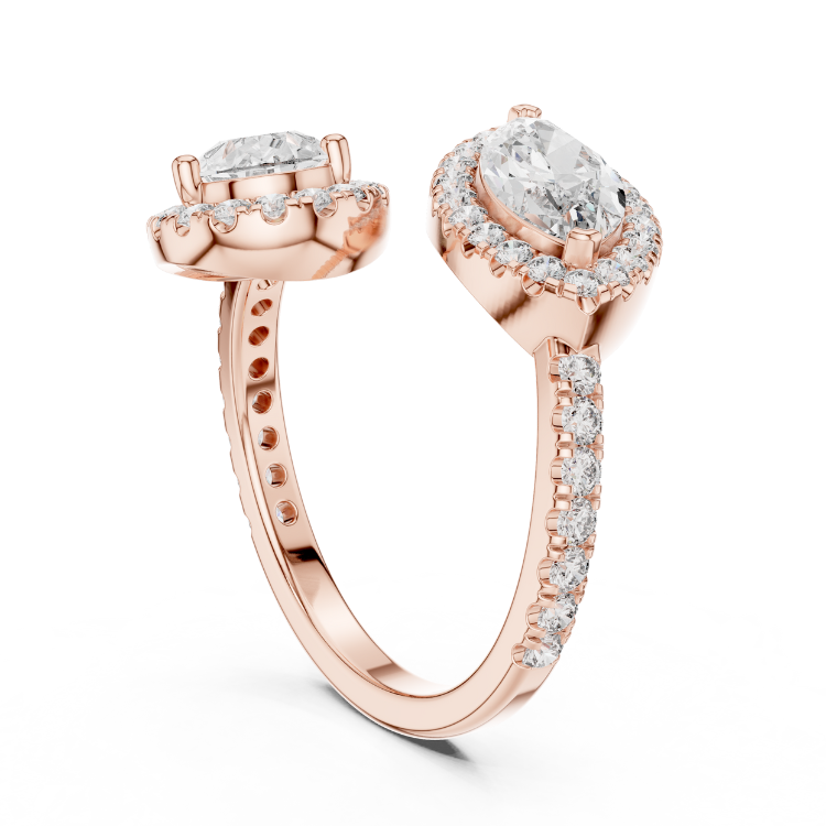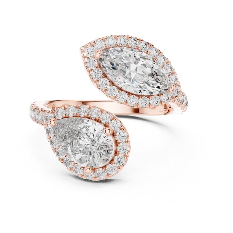 This striking ring blends white and rose gold to showcase 55 dazzling HPHT diamonds in a graceful mix of pear, marquise, and round shapes. With a total diamond weight of 2.63 carats, it offers a perfect harmony of sparkle and sophistication. Weighing 4.22 grams gross and 3.7 grams net in gold, this piece is a statement of timeless luxury. ?