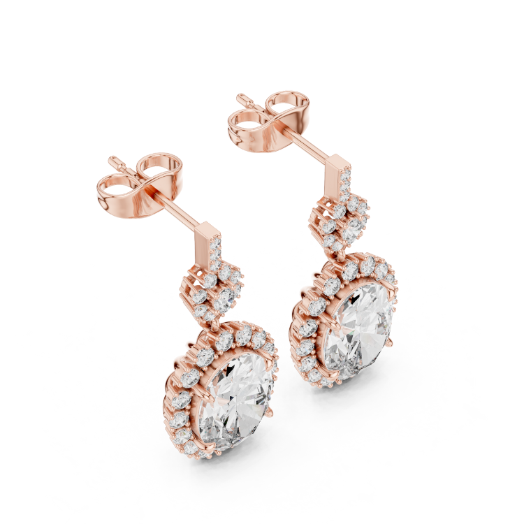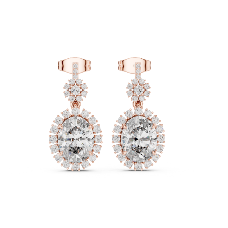 Crafted in luxurious white and rose gold, these striking earrings feature 58 HPHT diamonds in an elegant combination of oval and round cuts, totaling an impressive 3.99 carats. With a gross weight of 4.74 grams and a net gold weight of 3.95 grams, they radiate bold brilliance and timeless beauty. ?