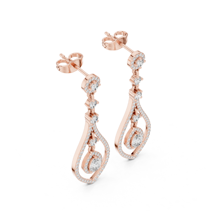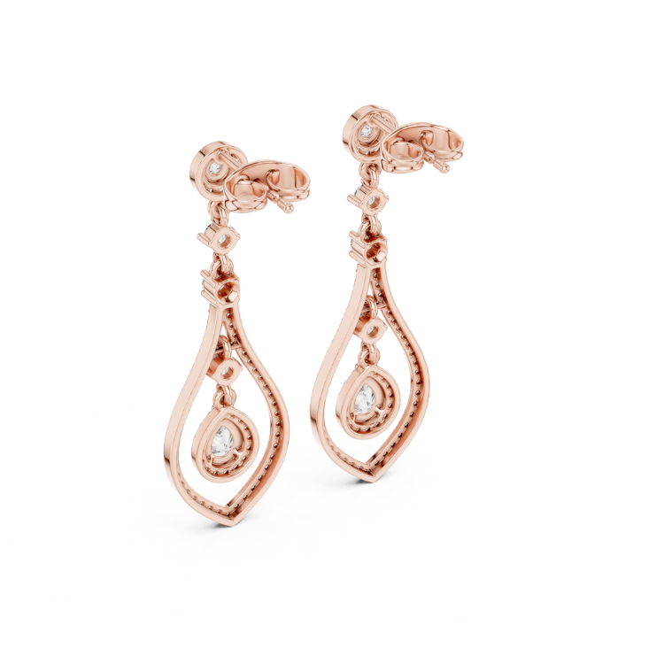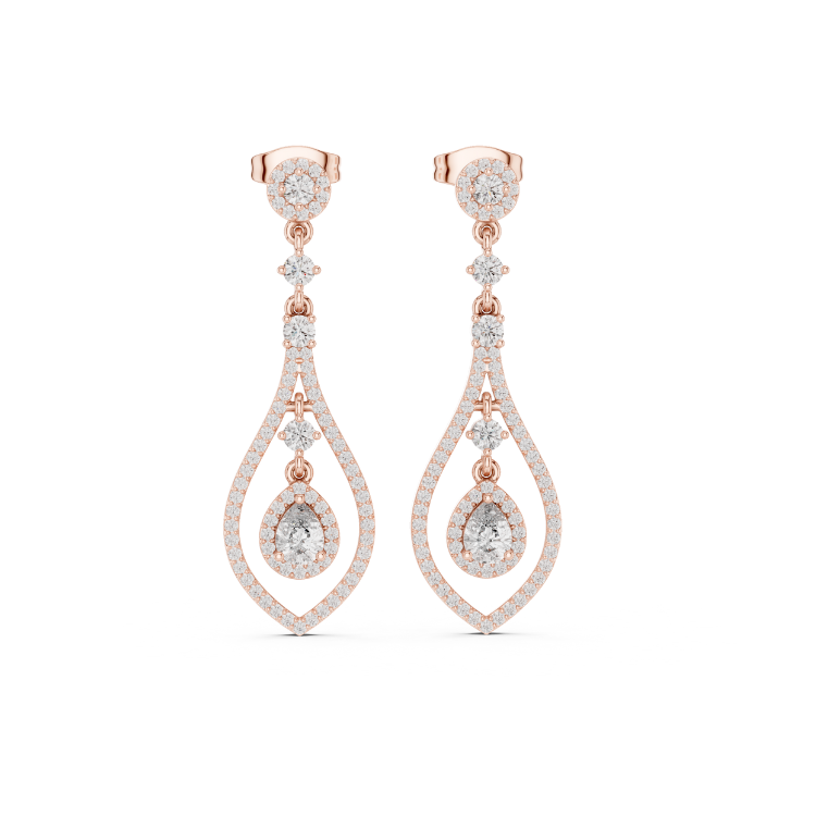 Delicately crafted from a radiant trio of White, Rose, and Yellow Gold, these earrings showcase an elegant fusion of modern charm and timeless luxury. Set with 154 finely cut HPHT diamonds in Pear and Round shapes, they reflect brilliance and sophistication with every movement.
